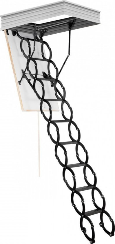 Vindstrappa Metal Box är som är gjorda även för minsta möjliga utrymmen. En populär klätterstege för sin enkla hantering. Tack vare saxstegen kan trappan enkelt förlängas för åtkomst till vinden och sedan dras in ifall trappan är stängd. Dessa infällbara vindstrappor fungerar som en enkel, praktisk och isolerad tillgång till vindsutrymmen. Saxtrappan har ett träisolerat 26 mm tjockt lock, som är försett med en vit HDF-skiva från den synliga sidan. Locket är isolerat med 20 mm polystyren. Saxtrappor tillverkas för en maximal golvhöjd på 290 cm och har en 14,5 cm hög metallram. Trappan har en utgångsstege helt i metall med halkfria steg. Maximal belastning för saxvindstrappor är 150 kg. I paketet ingår en neddragbar bar, en uppsättning fjädrar för enkel öppning och stängning av trappan och en stängningsmekanism (lås) - trappan behöver bara packas upp och monteras. Fällbara vindstrappor Saxar är den idealiska lösningen för en vindstillgång. Den är lämplig överallt där det inte ställs höga krav på byggnadens energieffektivitet. Värmeöverföringskoefficient U=1,22W/m2*K..